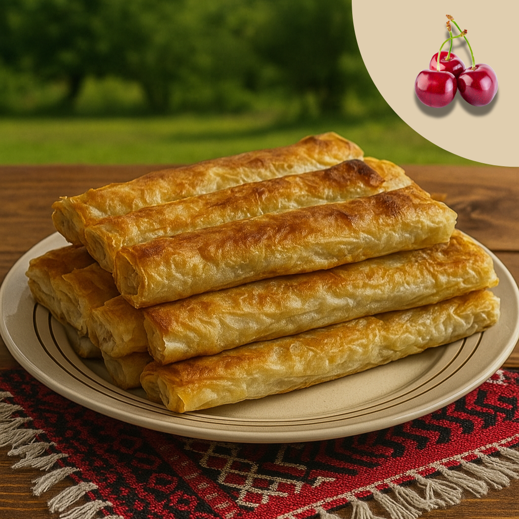 Пита са вишњама је десерт који се не прескаче. Пуњена је целовитим, замрзнутим вишњама и благим додатком шећера, умотана у наше ручно развучене коре — онакве какве су знала само стара домаћинства.