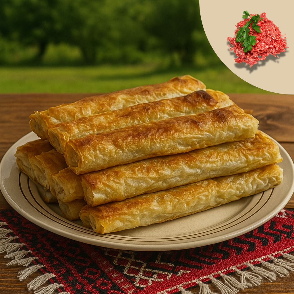 Правимо је од ручно развлачених кора из сопственог асортимана, пуњену свежим, термички обрађеним свињским месом, са црним луком, благим зачинима. Без адитива, без пречица — како и доликује.