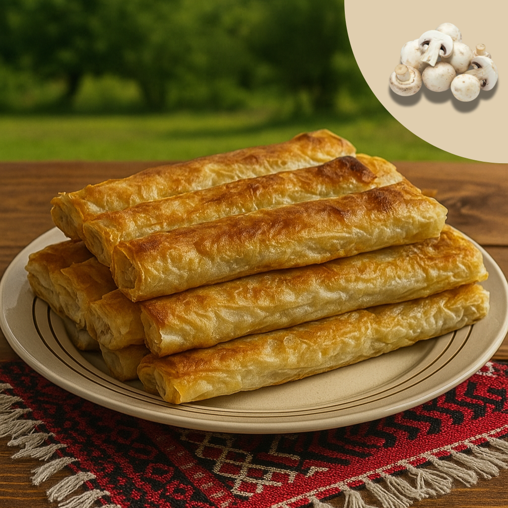 Наша пита са печуркама је потпуно постна, направљена од ручно развлачених кора и пуњена богатим, термички обрађеним филом од шампињона, црног лука и благих зачина.
