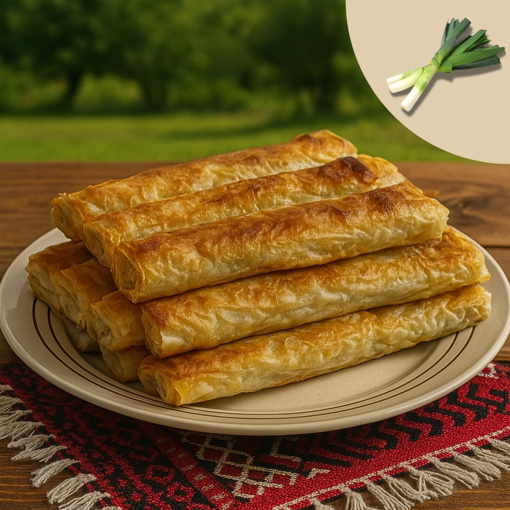Пуњена ситно сеченим празилуком, куваним пиринчем и благим зачинима, ова пита је нежна и мирисна, али довољно засита да стоји раме уз раме са сваком месном. Пуњење је термички обрађено, умотано у наше домаће, ручно развучене коре, и потпуно је постно.